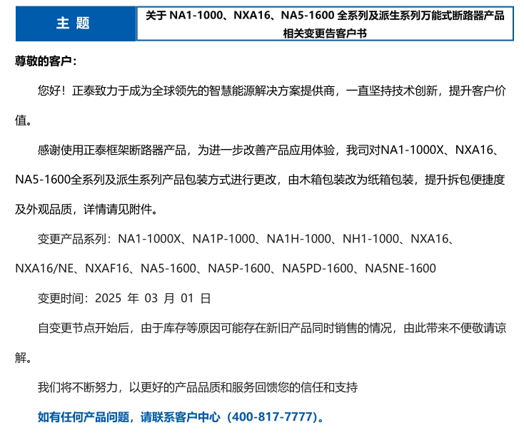 關(guān)于 NA1-1000、NXA16、NA5-1600 全系列及派生系列萬(wàn)能式斷路器產(chǎn)品 相關(guān)變更告客戶書