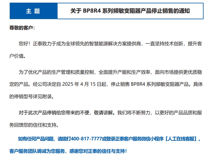 關(guān)于 BP8R4 系列頻敏變阻器產(chǎn)品停止銷(xiāo)售的通知
