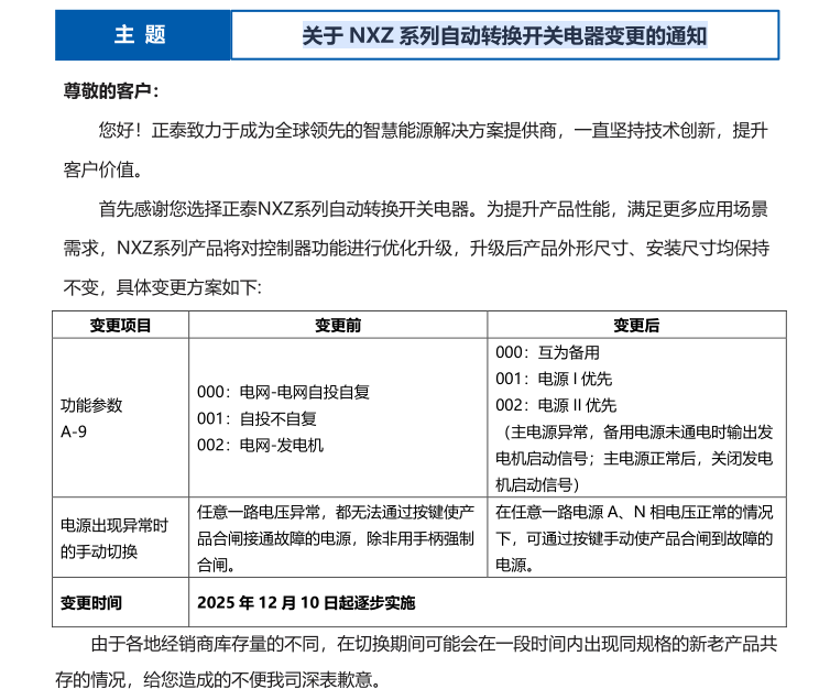 關(guān)于 NXZ 系列自動(dòng)轉(zhuǎn)換開關(guān)電器變更的通知